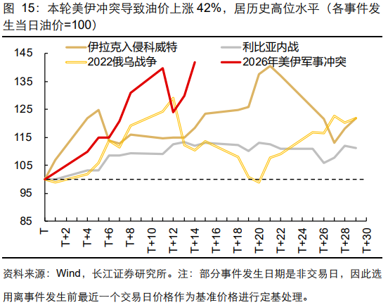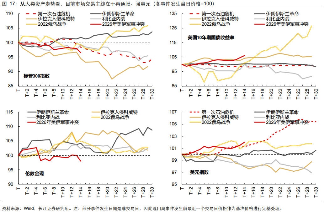 回顾1970年以来与中东相关的军事冲突事件,因石油供给严重受限导致油价飙升的案例可谓屡见不鲜。对标历史来看,本轮美伊冲突导致油价已上涨42%,仅次于前三次石油危机(前三次石油危机油价最高涨幅分别为3.8倍、2.1倍、0.8倍)。油价飙升推动市场再通胀交易预期:美股走弱、美债利率上行、美元指数走强。