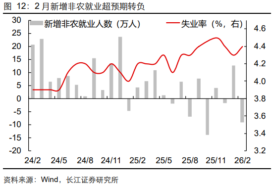 一方面,美国经济K型分化严重,(去年三季度)AI相关行业占经济的比重仅为12%,但贡献了42%的经济增长,传统部门仍受到利率偏高、需求偏弱压制。另一方面,2月新增非农受罢工、天气影响等因素超预期转负至-9.2万人,2月失业率回升至4.4%,就业下行风险有所抬升。