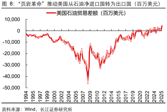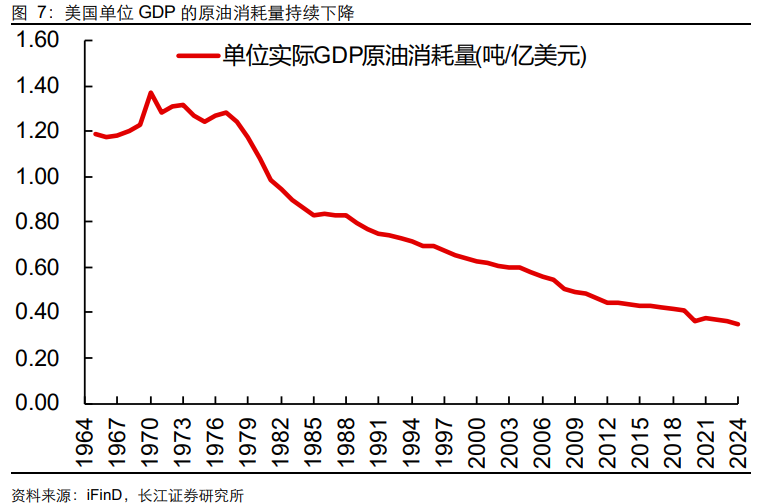 一方面,在能效提升(技术和工艺的进步使得单位产出能耗更低)、经济转型(经济结构从重工业向服务业、科技产业等低能耗产业倾斜)、能源替代(在供暖、发电等领域,石油被天然气、可再生能源等更高效或更清洁的能源替代)等因素推动下,美国单位实际GDP的原油消耗量从1970年的1.372吨/亿美元降至2024年的0.348吨/亿美元,降幅达75%。