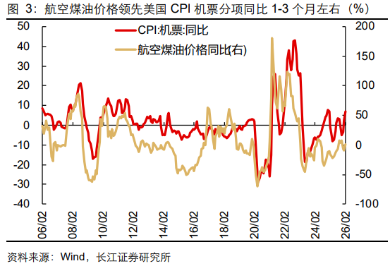 2)二是油价攀升推升航空煤油等下游产品价格。航空煤油是机票价格的重要成本组成。从历史经验看,航空煤油价格领先美国CPI机票分项同比1-3个月左右。机票在美国CPI中的权重约0.94%,油价攀升将在一定程度上加大CPI上行压力,但影响较汽油偏小。