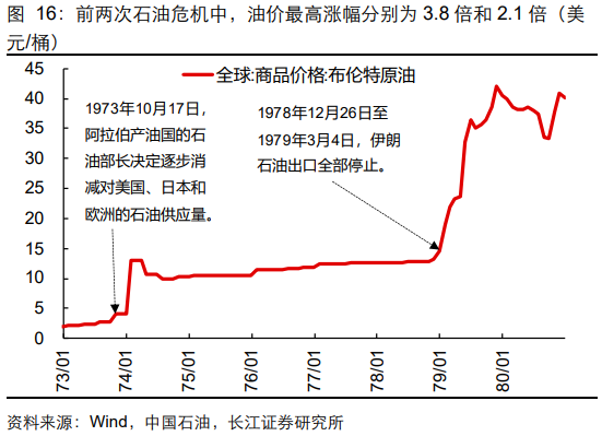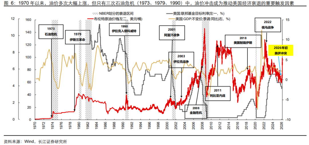 2、高油价催生通胀上行风险,但并不必然伴随经济衰退:1970年以来,全球油价经历多次大幅上涨,但只有三次石油危机中,油价冲击成为推动美国经济衰退的重要触发因素。