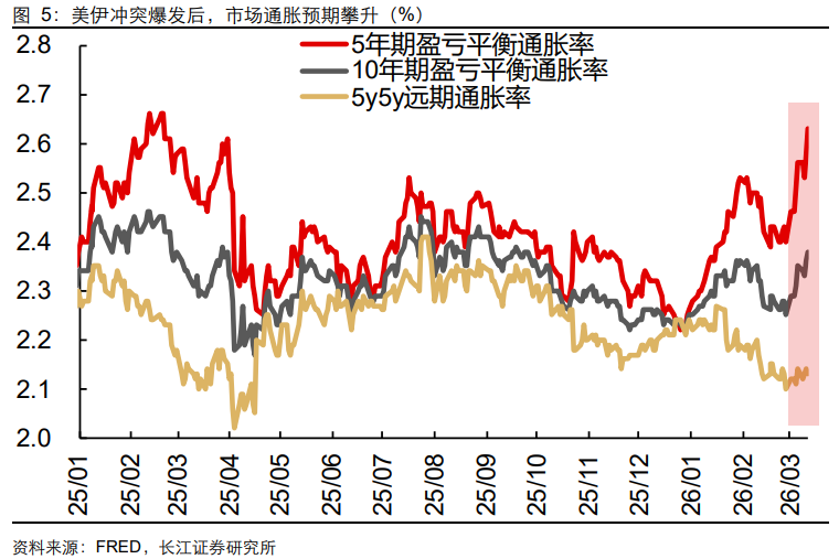 4)四是油价高位盘整或将抬升日用品等商品价格。综合来看,美国CPI中枢或从当前的2.4%左右抬升至3%/4%左右。市场已在交易再通胀预期:截至3月12日,美国5Y BEI、10Y BEI、5Y5Y(分别表示市场的短中期、中长期、长期通胀预期)较美伊冲突前分别提升0.23、0.13、0.03pp至2.63%、2.38%、2.13%。