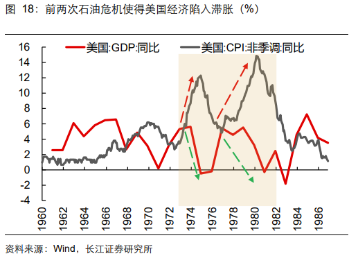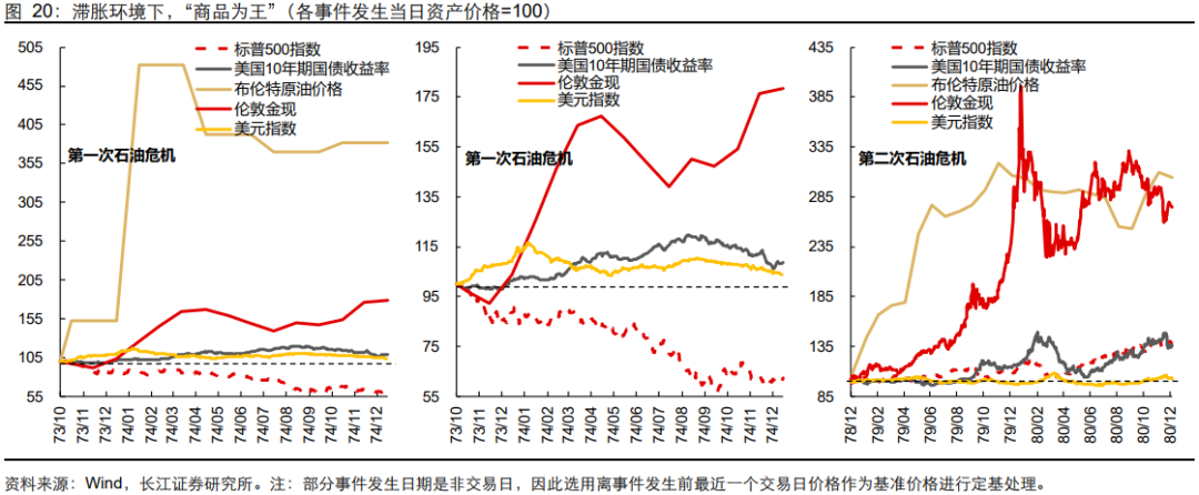 但值得警惕的是:美伊冲突长期化可能将美国再次推向滞胀。参考前两次石油危机,滞胀环境下,以油、金为代表的资源品涨幅将远超其他大类资产。