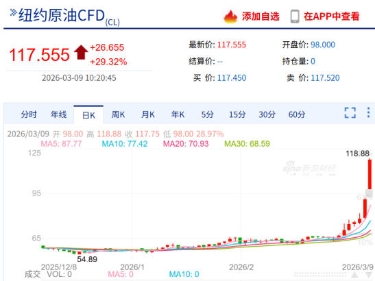 3月9日,WTI原油与布伦特原油期货价格双双突破119美元大关,WTI单日涨幅一度突破30%,刷新了三年多以来的最高点位。